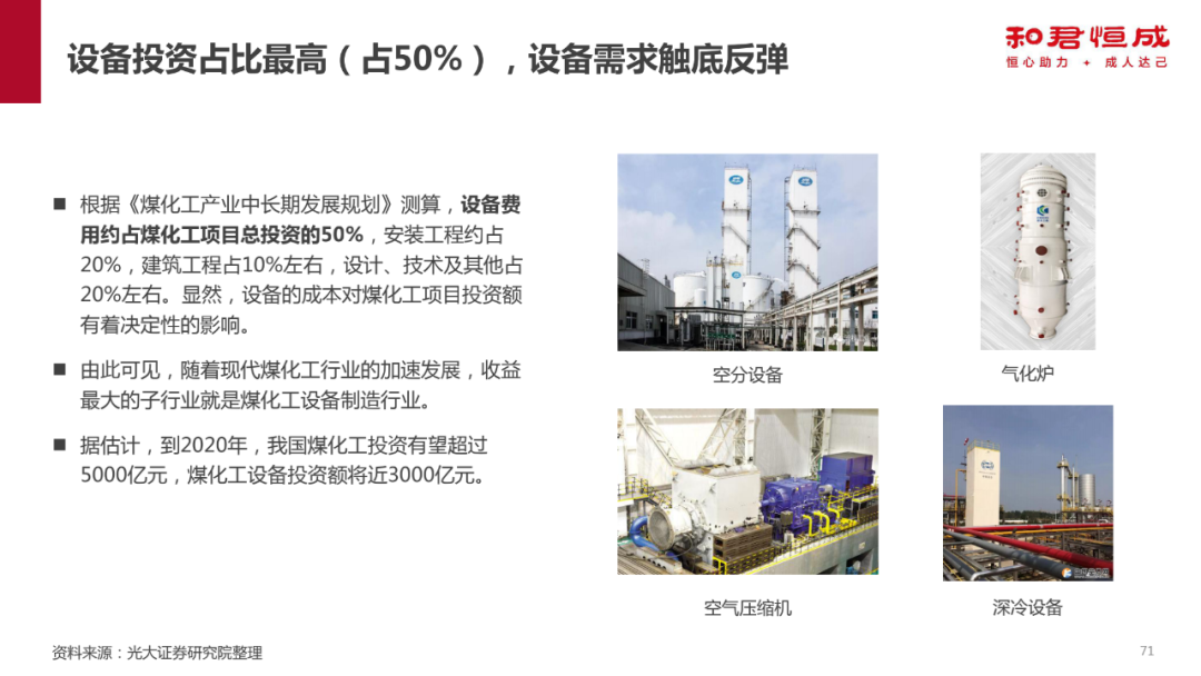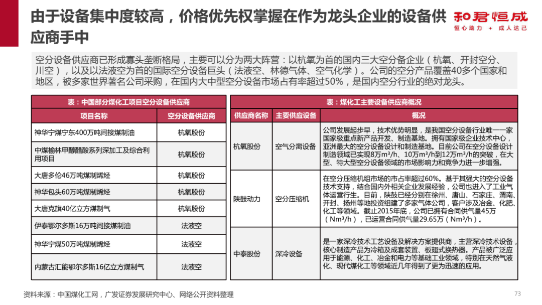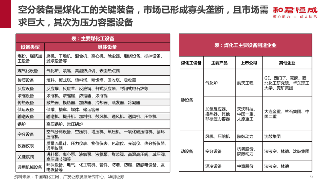 空分装备是煤化工的关键装备,市场已形成寡头垄断,且市场需求巨大,其次为压力容器设备;